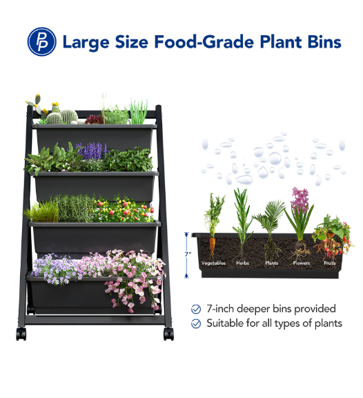 FLEXIMOUNTS Premium Design Garden Bed 4-Bin, 4ft Vertical Garden Bed is the ideal freestanding garden bed. It is space-saving and easy to assemble. Easily build your lush garden filled with delicious vegetables, fresh herbs, blooming flowers, exotic succulents, and more! Its stable structure made of durable materials is suitable for both indoor and outdoor use. Due to the scientific drainage system and stable structural support, it can work well even in outdoor wind and rain. The annular sink and vertical structure ease your daily watering work. This ergonomic design is exactly what you need!