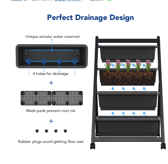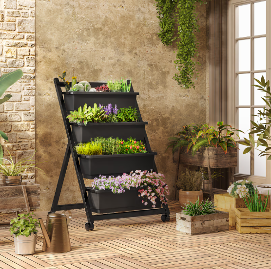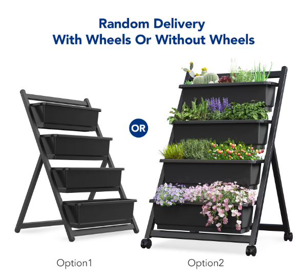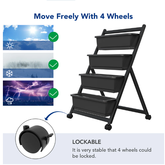Product Name: Vertically Raised Garden Bed with Wheels, 4 Tiers Independent Standing Garden Flower Pot with Lockable Casters and 4 Drain Tanks, Suitable for Growing Vegetables and Flowers in Terrace Balcony Garden